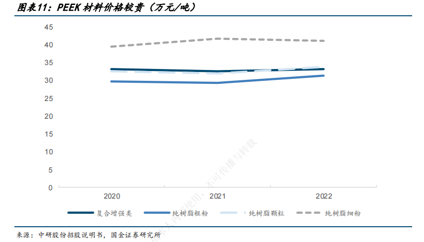 价格方面,目前PEEK材料国内价格约30-40万元/吨,国外约80-100万元/吨,整体价格较贵,主要系核心原材料氟酮价格较高。每生产1吨PEEK材料约需0.7-0.8吨氟酮单体,氟酮成本占比过半。换言之,氟酮也将直接决定PEEK材料产品的质量,氟酮价格的变化也将影响PEEK材料的毛利率。