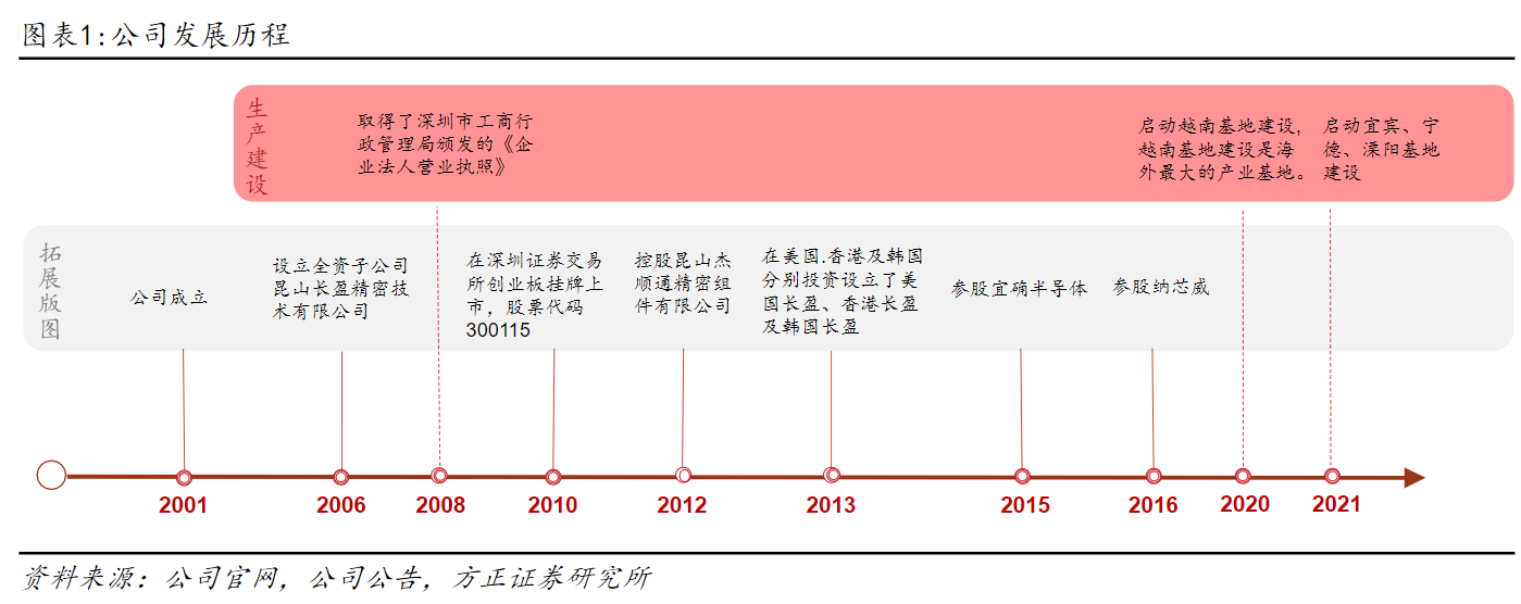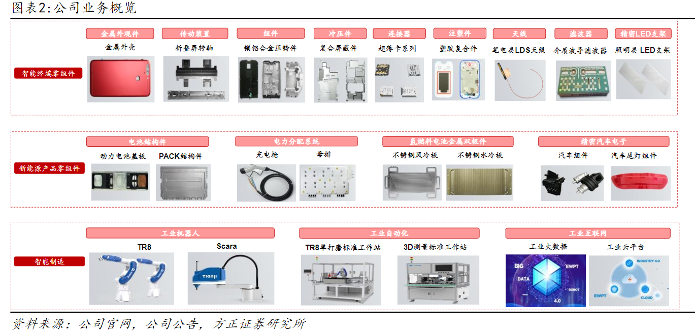 公司精密零组件龙头企业,双支柱战略格局初步形成,上市后后通过内生外延的方式不断扩大自身版图,目前消费类电子精密结构件及模组、新能源产品零组件及连接器的双支柱战略格局已初步形成,拥有智能终端零组件、新能源产品零组件、智能制造三大业务板块。