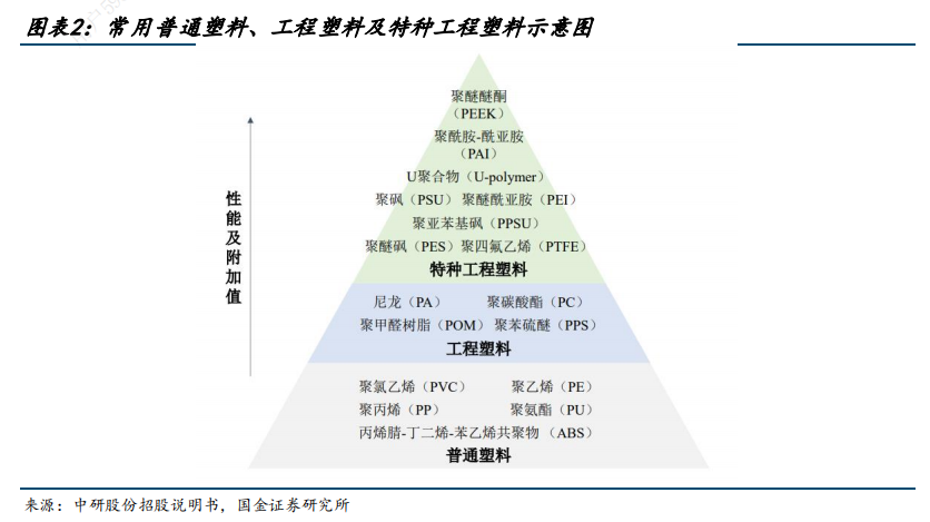 PEEK材料是一种特种工程塑料,具备耐热、阻燃、耐磨、耐腐蚀等优势。和普通的工程塑料相比,PEEK材料兼具刚性和韧性。和金属材料相比,PEEK材料重量轻,比强度大,材料性能全面优于钢、铝合金,可以满足下游汽车领域轻量化趋势,实现以塑代钢。