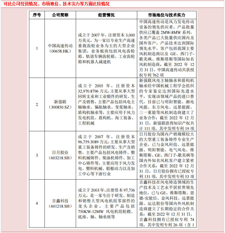 公司是我国首台10MW海上风电机组、陆上单机大兆瓦风机组EN-220/10MW的偏航减速器和变桨减速器供应商;2022年,公司已开始向远景能源14MW风电机组、东方风电13MW风电机组交付相应大功率减速器产品,在大功率风电变速器领域形成较为明显的领先优势。