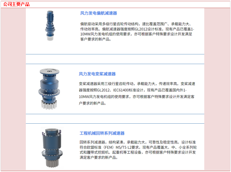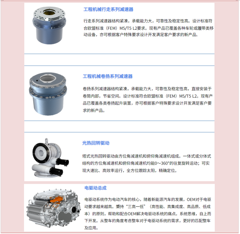 主要产品包括风电偏航减速器、风电变桨减速器、工程机械回转系列减速器、工程机械行走系列减速器、工程机械卷扬系列减速器、光热回转驱动、电驱动总成等,致力于为新能源产业提供精密传动解决方案。