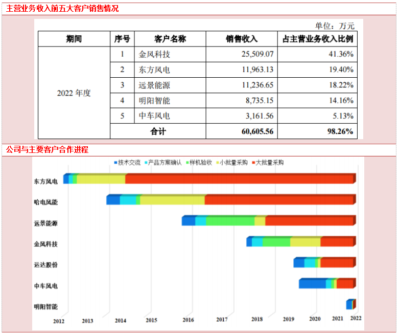 2022年,公司对金风科技销售收入超过主营业务收入40%,主要系下游风电行业客户集中且公司与金风科技合作关系不断深化所致,金风科技为我国风电整机行业龙头企业,其自身经营不存在重大不确定性,公司对金风科技收入占比超过50%不会对公司生产经营造成重大不利影响。