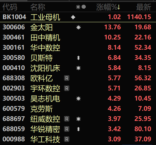 受此消息影响,6月14日,工业母机概念股拉升。截至发稿,金太阳上涨13.76%;田中精机、华中数控、贝斯特、沈阳机床等涨超5%;华锐精密、纽威数控、科德数控、秦川机床等跟涨。
