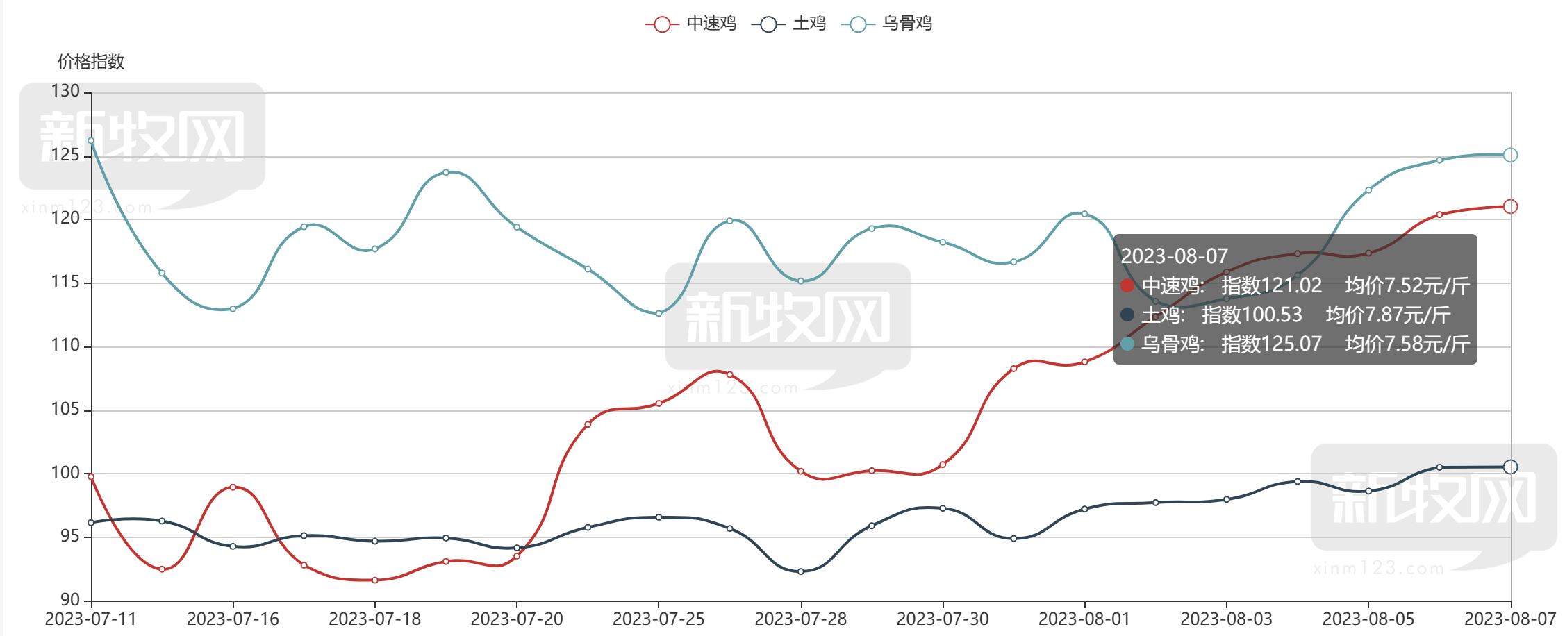 此外,从新牧网监测数据来看,从7月18号开始,中速鸡价不断攀升,截至目前已经到达15.04元/公斤,全面超过养殖成本线。