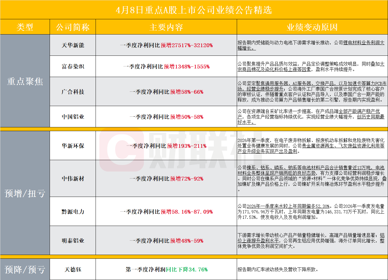 天德钰等多家A股上市公司发布2026年一季度业绩预告/报告。其中,