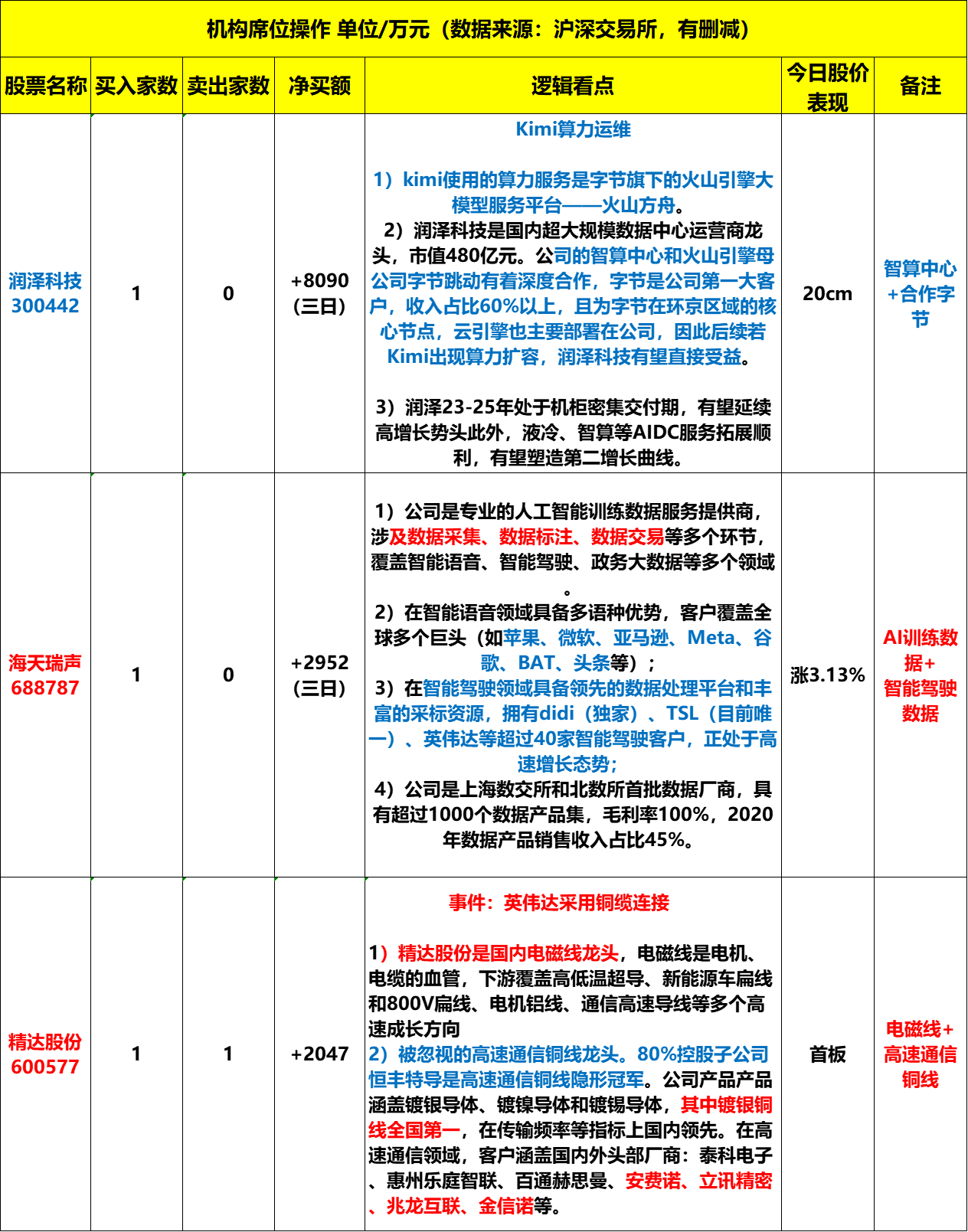 1)核心逻辑:AIDC字节系、阿里系最受益。【润建股份】属于阿里系:阿里重仓持股月之暗面,阿里云或将成为算力服务提供商。润建股份去年公告与阿里云进行智算中心方面的合作,五象云谷数据中心有望需求起量,有望受益。
