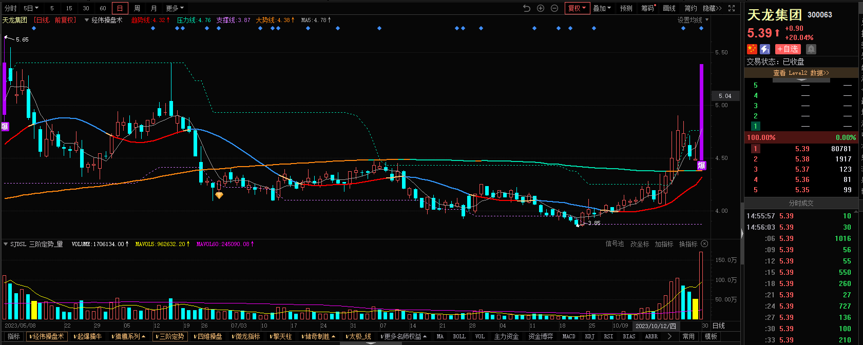 3)参考技术指标:天龙集团-经伟操盘术指标-出现爆点信号