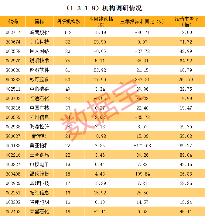 近一周机构调研个股数量有100只,岭南股份成为近一周调研机构数量最多的股票。