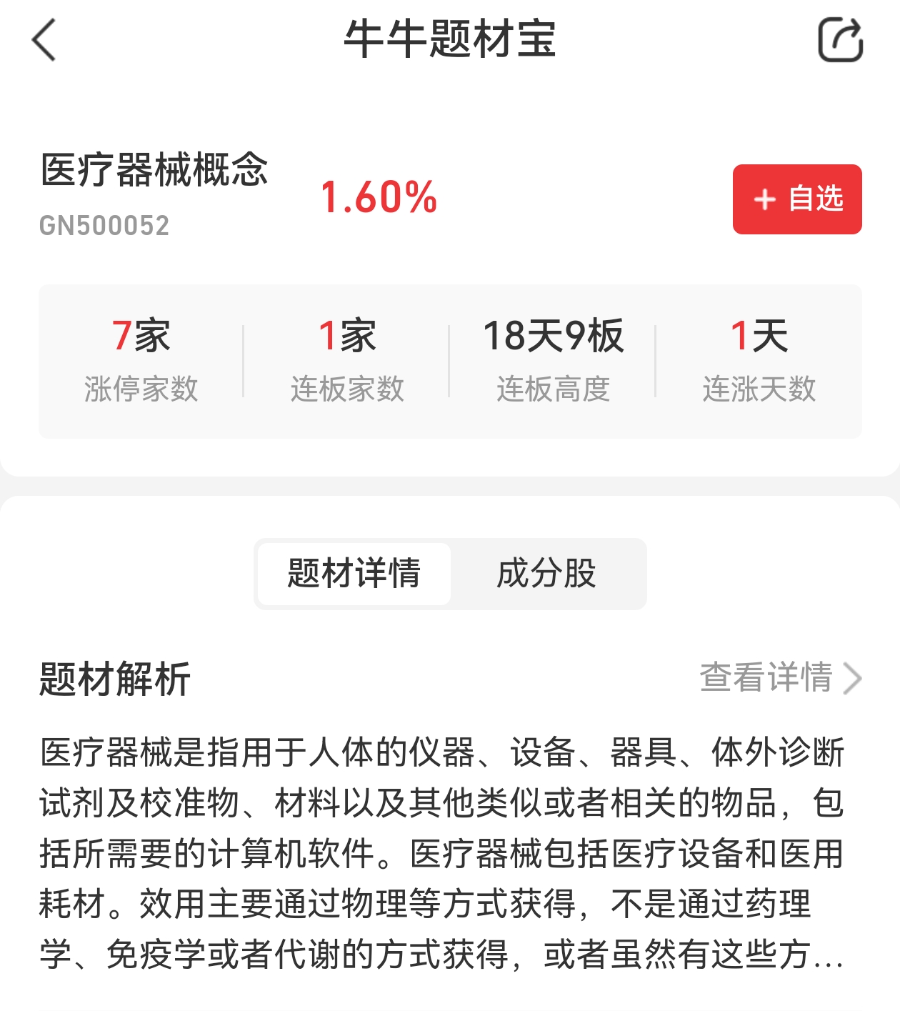小九注:上海重磅文件发布!医疗器械产业链站上风口!近期该题材资金活跃,今日井喷7只涨停,后市将如何演绎?点击此处解锁牛牛题材宝——你的题材研究助手,查看详情>>