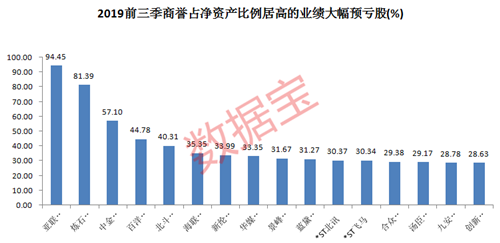 数据宝统计显示,以上71家公司有44股存在商誉金额,19股前三季商誉占净资产比例超过20%,16股更是超过了25%。