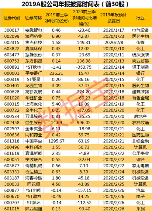最早披露年报的30家公司中,ST股有5只,包括*ST电能、*ST秋林。ST亚星2019业绩或首亏。2只业绩预增股益生股份、中科创达分别于2月20日、2月21日发布2019年报。2股2019年前三季净利润均大幅增长,前者2019年净利润增幅预计超500%,后者超40%。金禾实业预计2月21日发布年报,2019年业绩预减。