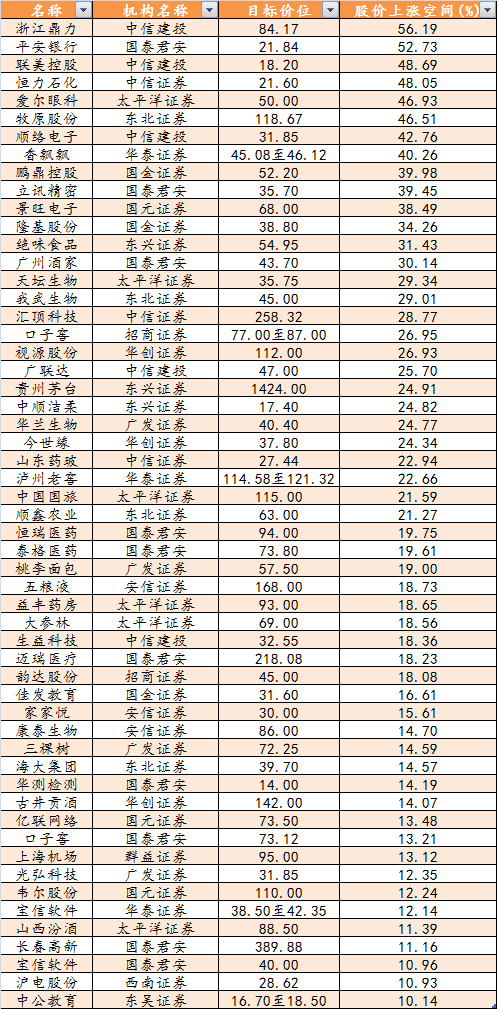 数据显示,在机构给予的最高价目标价评级中,截至9月3日收盘,距离目标价涨幅空间仍有20%以上空间的公司共有28家,其中浙江鼎力、平安银行、联美控股、恒力石化、爱尔眼科、牧原股份、顺络电子、香飘飘、鹏鼎控股、立讯精密、景旺电子、隆基股份、绝味食品、广州酒家目标涨幅空间在30%以上。