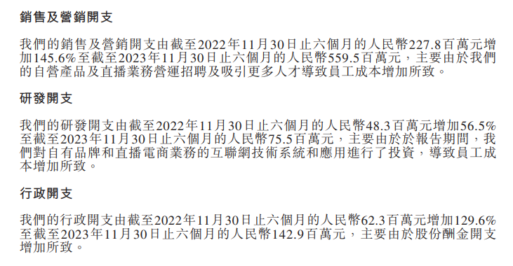 净利润为何同比下降?东方甄选业绩公告显示,公司的业务大幅增长,导致自营产品的存货成本及运输成本增加。同时,报告期内公司多项开支扩大。例如,销售及营销开支约5.6亿元,同比增长145.6%;研发开支约0.76亿元,同比增长56.5%;行政开支约1.43亿元,同比增长129.6%。