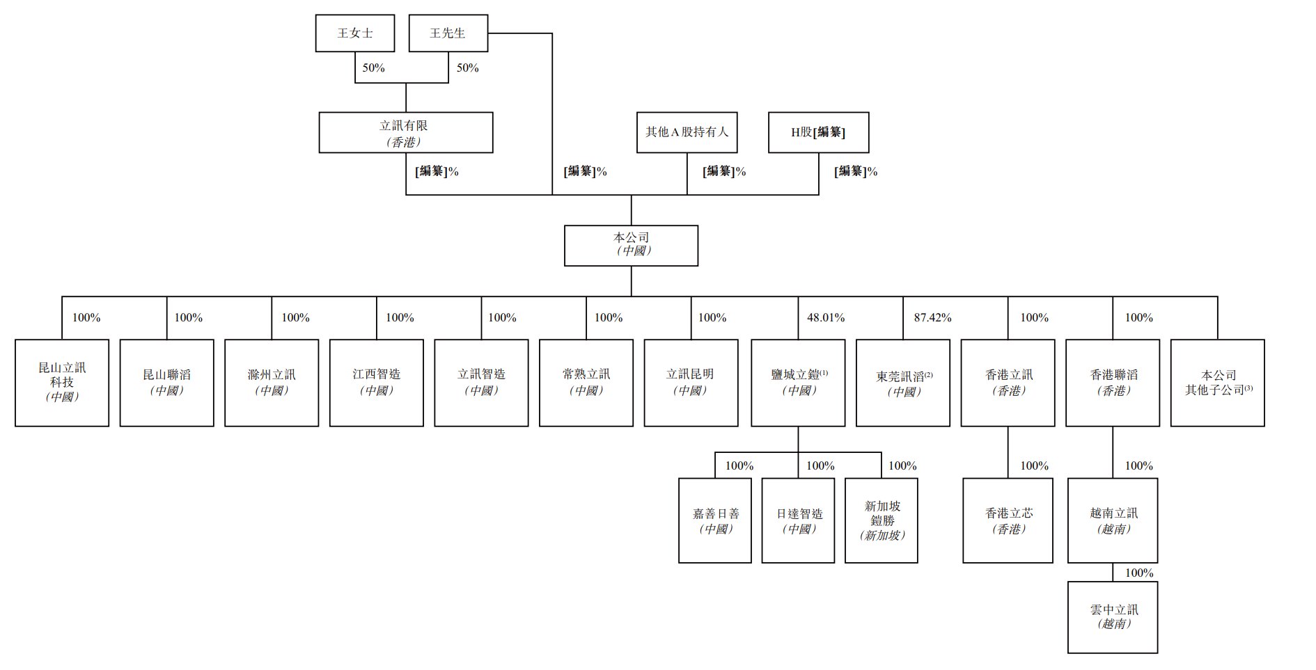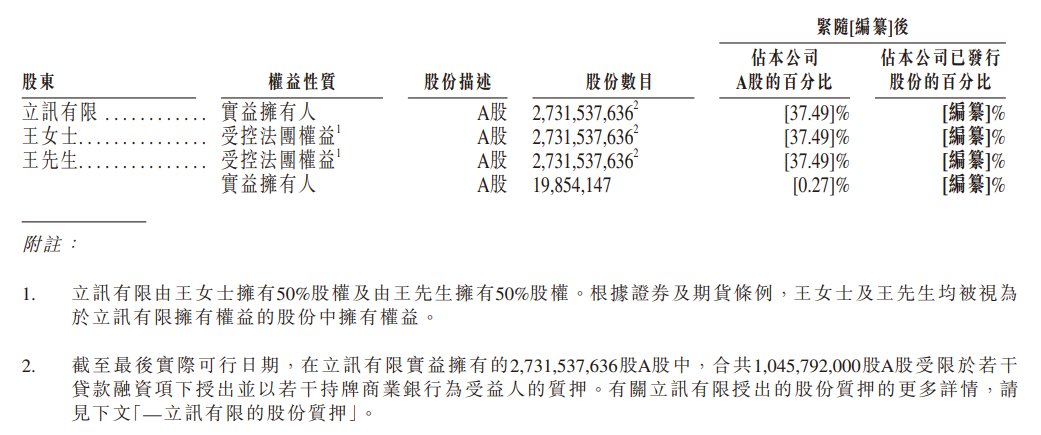 截至最后实际可行日期,公司由(i)立讯有限(一家由王女士及王先生分别拥有50%及50%的公司)持有约37.49%;及(ii)由王先生持有约0.27%。