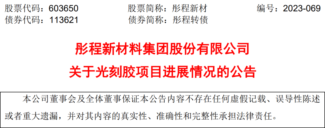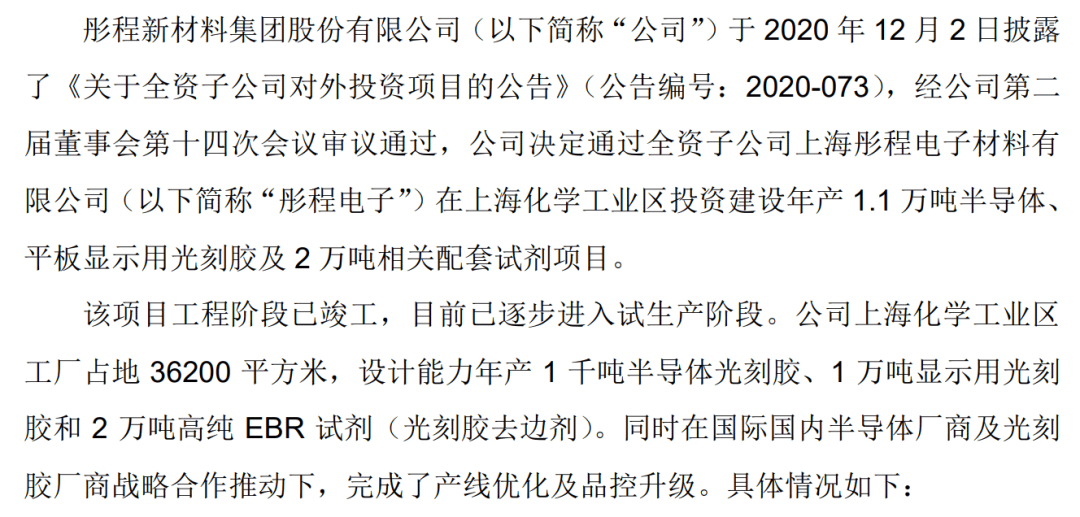 11月5日晚间,彤程新材公告称,公司全资子公司上海彤程电子材料有限公司(简称“彤程电子”)在上海化学工业区投资建设年产1.1万吨半导体、平板显示用光刻胶及2万吨相关配套试剂项目的工程阶段已竣工,目前已逐步进入试生产阶段。