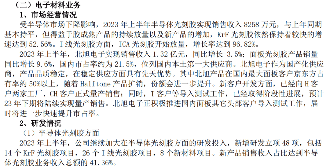 此前,彤程新材在2023年半年报中披露,报告期内公司继续加大在半导体光刻胶方面的研发投入,新增研发立项48项,包括14个KrF光刻胶项目,26个I线光刻胶项目,8个新材料项目。新产品销售收入占比达到半导体光刻胶业务收入总额的41.36%。今年上半年,KrF光刻胶依然保持着较快的增速达到52.56%;I线光刻胶方面,ICA光刻胶开始放量,增长率达到96.82%。