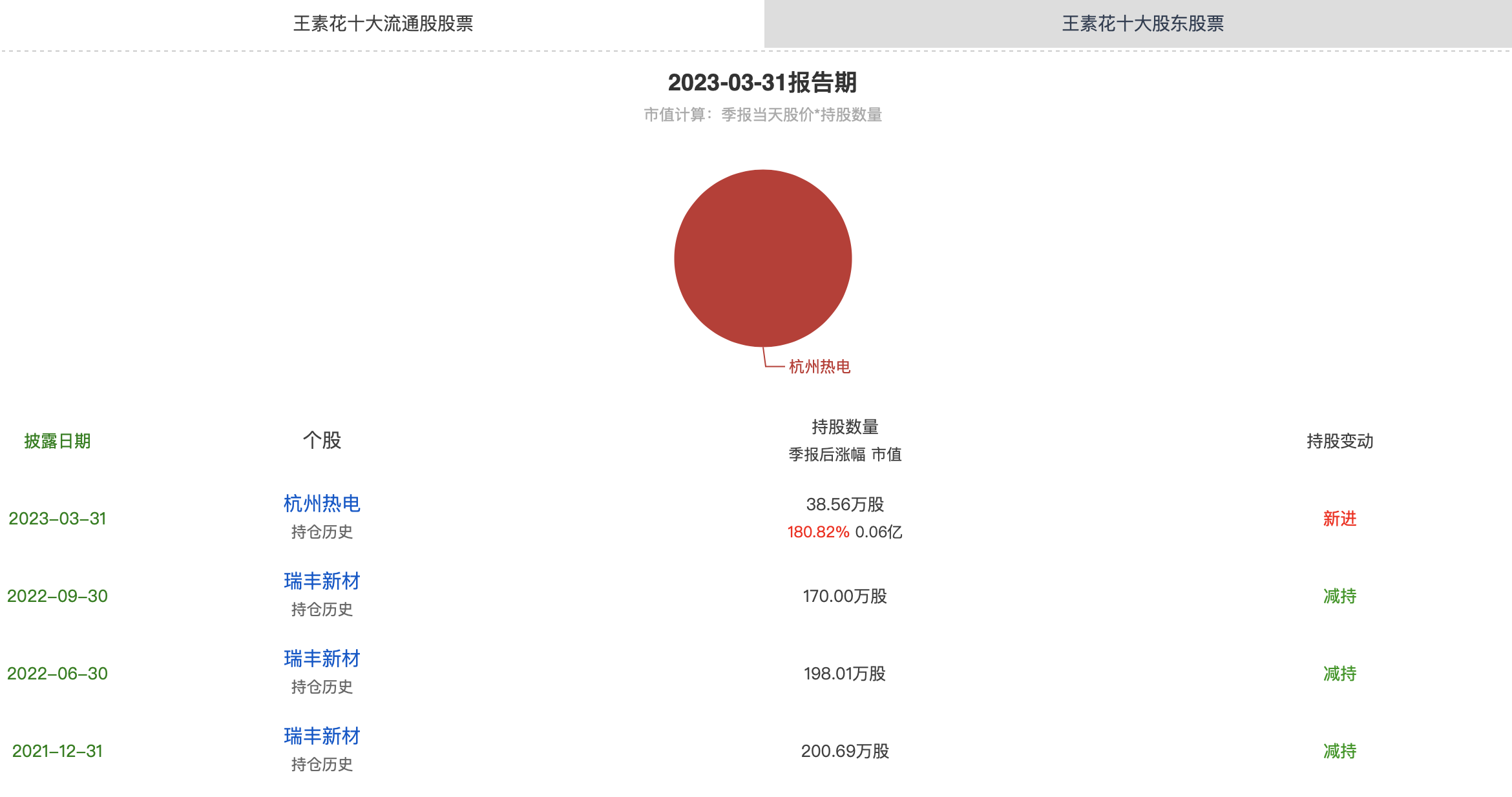 除了散户、机构资金,一些提前潜伏的投资者,在杭州热电次轮暴涨中获益颇丰。一季报显示,公司前十大流通股东中,还有五名新进的自然人股东,持股数量在14.7万股~38.6万股不等。其中持股最高的自然人为“牛散”王素花,持股数量为38.6万股。
