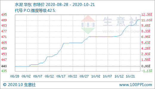 据生意社监测显示,近期,华东地区水泥行情上涨,14日价格为479.90元/吨,21日华东地区水泥价格为490.40元/吨,涨幅为2.38%,当前价格环比上涨了5.33%,当前价格同比去年上涨了0.82%。水泥价格进入10月后,天气晴好,水泥市场需求持续上升,库存下降较快,总体来说水泥价格处于上行通道。