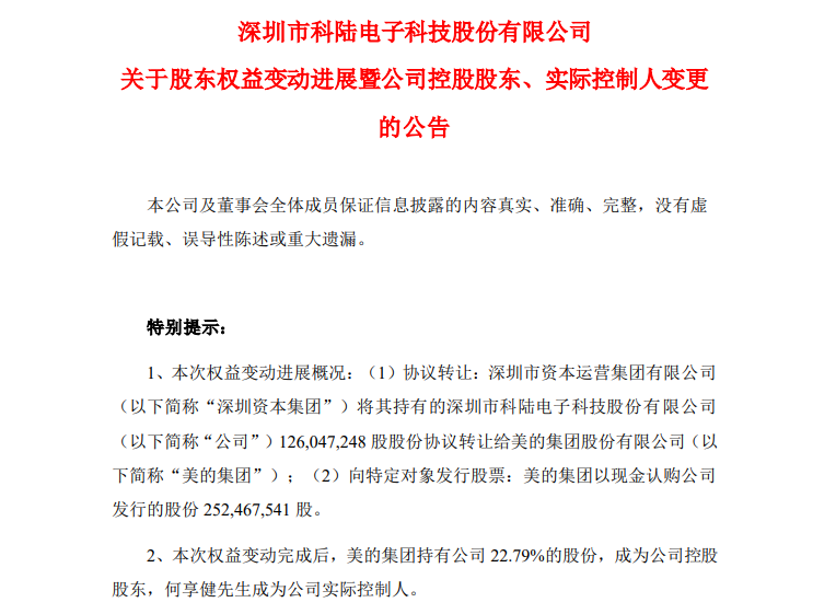 去年5月,美的集团入主科陆电子的交易披露。按照交易方案,美的集团通过“委托表决权+定增”的方式,从深圳资本集团手中拿下科陆电子实控权。