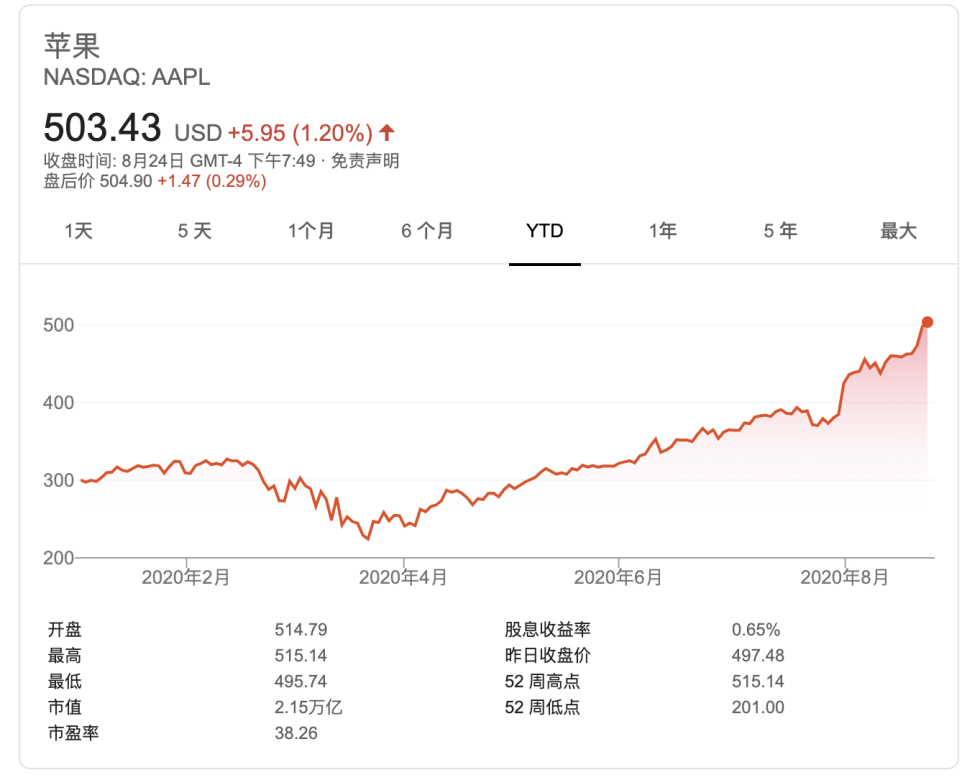 美东时间周一(8月24日),苹果股价延续涨势,收盘涨1.2%,报503.43美元。上周,该股在四个交易日中上涨了8.5%,成为首家市值达到2万亿美元的美国公司。