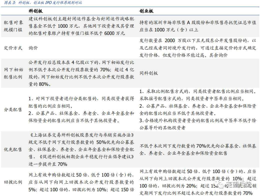 与此同时,《上海证券交易所科创板股票发行与承销实施办法》规定不低于网下发行股票数量的50%优先向公募基金、社保基金、养老金、企业年金基金和保险资金配售,《促进科创板初期企业平稳发行行业倡导建议》进一步提升至70%,而创业板则直接在《发行与承销业务细则》中明确,网下发行数量中的不低于70%优先向公募基金、社保基金、养老金、企业年金基金和保险资金配售。