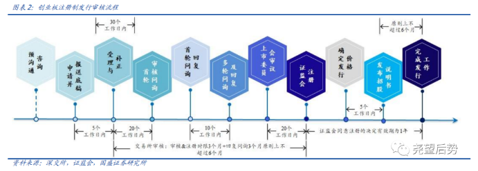 其次,发行流程上,也大致流程与科创板相同,区别在于创业板规定交易所审核+证监会注册的时间总计不超过三个月,较科创板以及此前征求意见稿的交易所审核3个月+证监会注册20天的规定,期限再次缩短。