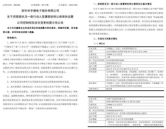 5月30日晚间,ST宇顺公告,公司控股股东中植融云及一致行动人中植产投拟将合计持有的部分宇顺电子股份7566.85万股(占公司股份总数的27%),协议转让给上海奉望实业有限公司(简称“上海奉望”)。如能签署正式的股份转让协议且履行完毕,公司控股股东将变更为上海奉望,实际控制人将变更为张建云。