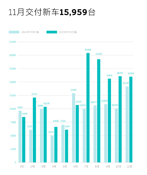 蔚来11月共交付新车15,959台,同比增长12.6%;1-11月,蔚来共交付新车142,026台,同比增长33.1%。蔚来新车已累计交付431,582台。