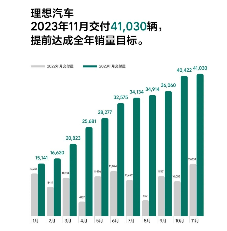 理想汽车11月共计交付新车41,030辆,同比增长172.9%。截至2023年11月30日,理想汽车全年累计交付325,677辆,提前达成2023年30万辆目标。