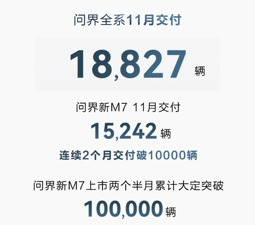 11月,鸿蒙智行旗下的AITO问界系列共交付新车18827辆。问界新M7交付新车15242辆,累计交付超27000辆。预计12月可交付新车23000辆,2024年起单月交付能力预计将达到30000辆。