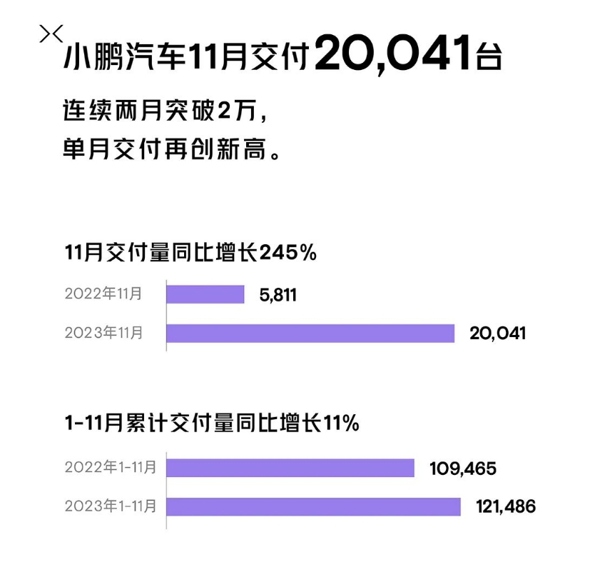 11月小鹏汽车共交付新车20,041台,同比增长245%,连续2个月月交付突破两万,再创单月交付新高。小鹏G6交付8,750台,继续领跑20万以上中国品牌纯电动SUV月销量榜。今年以来,小鹏汽车已连续10个月保持月交付正增长,截至11月末,2023年累计交付量达121,486台,超2022年全年累计交付量。