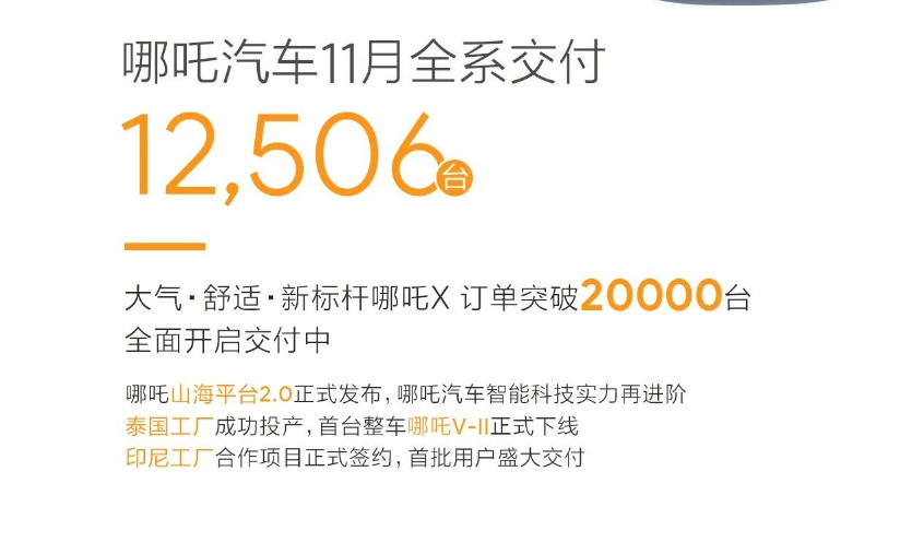 哪吒汽车11月全系交付12506台。哪吒X订单突破20000台,全面开启交付中。