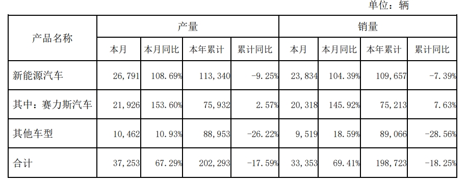 11月赛力斯汽车销量20,318辆,同比增长145.92%。