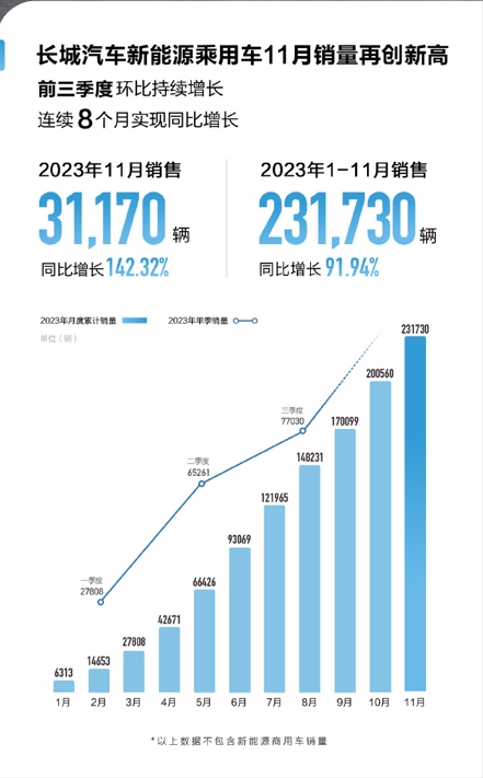 11月,长城汽车新能源乘用车销售31,170辆,同比大增142.32%;1-11月累计销售23.2万辆,同比增长91.94%,前三季度环比持续提升,连续8个月实现同比增长。