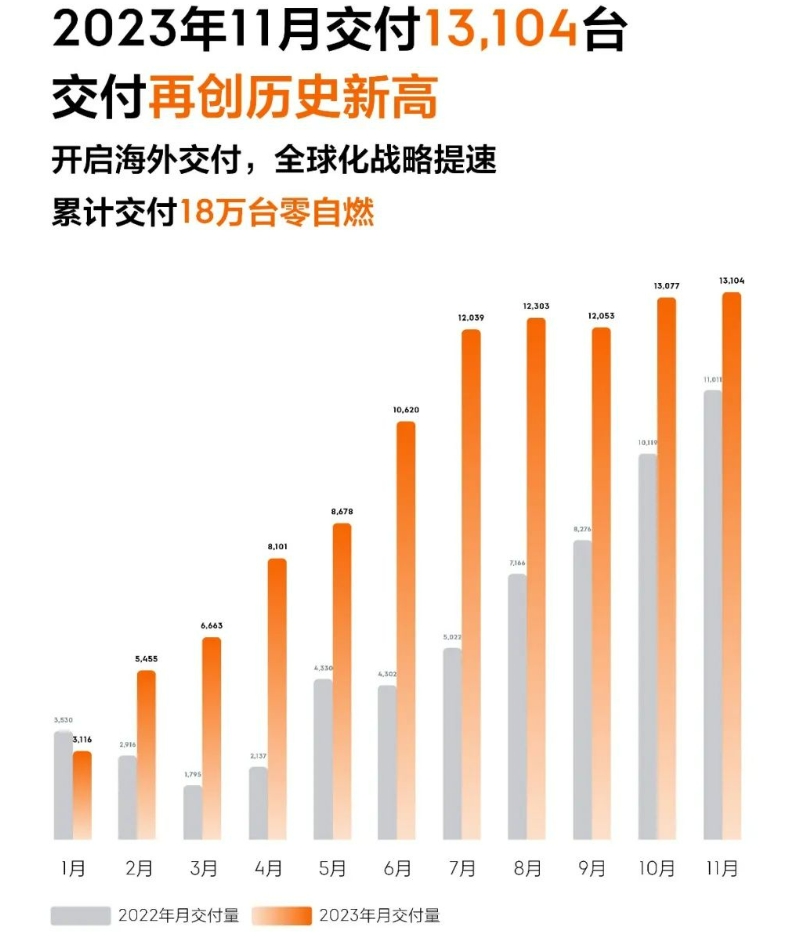 极氪11月交付达13104台,同比增长19%,再创历史新高,累计交付18万辆。