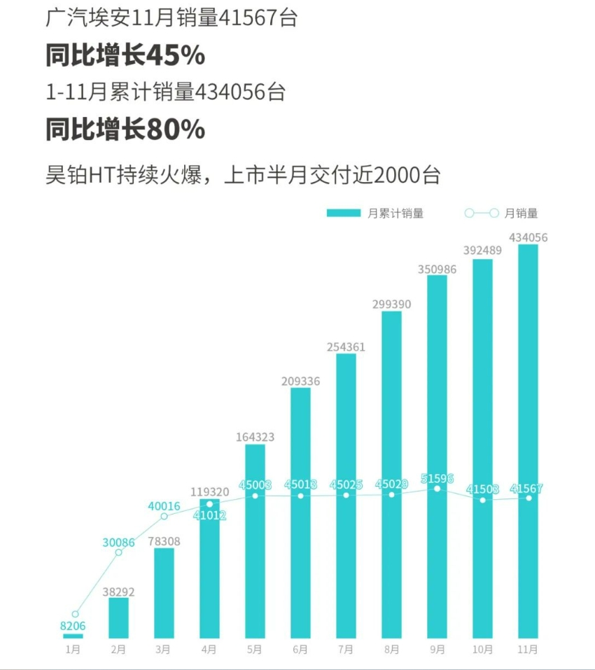 广汽埃安11月销量41567台,同比增长45%。1-11月累计销量434056台,同比增长80%。昊铂HT上市半月交付近2000台。