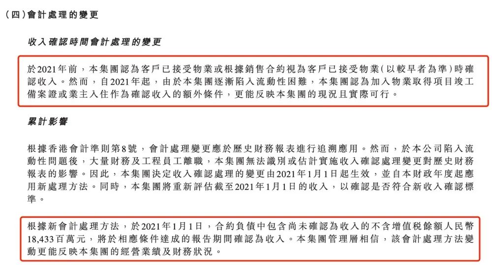 翻开财报发现,亏损增加主要与2021年恒大汽车“收入确认时间会计处理的变更”有关。按照恒大汽车的说法,在2021年前公司的地产业务是“以客户接受物业时点”或“根据合约获得客户接受时点”来确认收入。但从2021年起,恒大汽车决定将收入确认方式变更为“获得项目竣工证书”或“业主入住”。