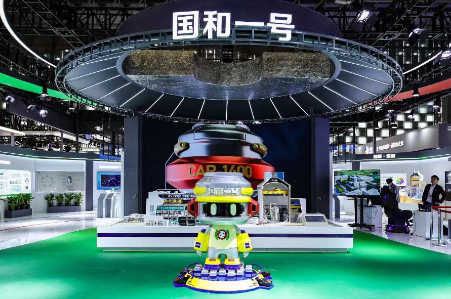 头戴核岛安全壳顶部造型头盔、脚穿核工业安全鞋、屹立在堆芯燃料组件的底座,在国家电投展台,充满科技风又不失可爱的“国和一号”IP形象引来诸多参观者打卡拍照。