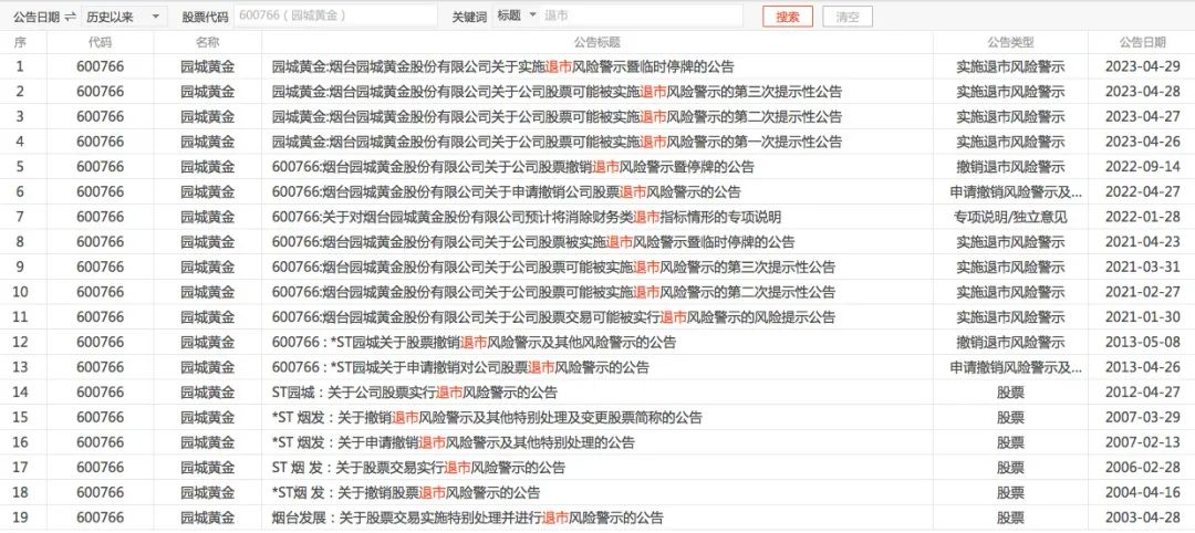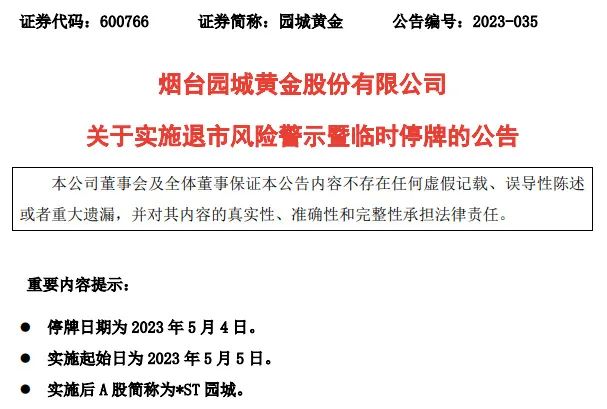 此前公告显示,因2022年度归母净利润为负值且营业收入低于1亿元,园城黄金股票将于2023年5月5日起被实施退市风险警示,证券简称也将变更为“*ST园城”。