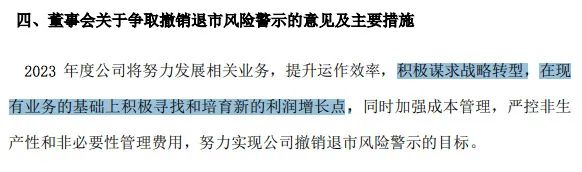 对于如何撤销退市风险警示,*ST园城表示,2023年公司将努力发展相关业务,提升运作效率,积极谋求战略转型,在现有业务的基础上积极寻找和培育新的利润增长点,同时加强成本管理,严控非生产性和非必要性管理费用,努力实现撤销退市风险警示的目标。
