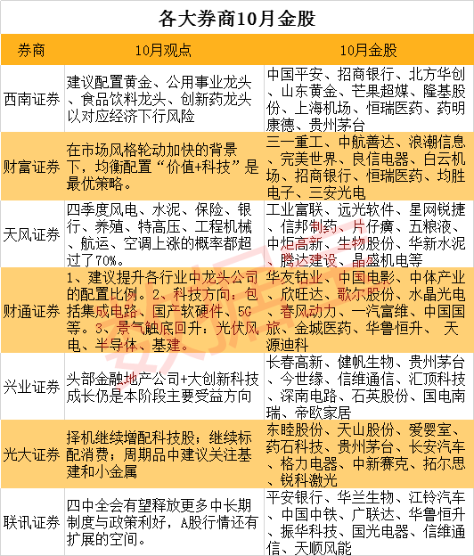 对于10月行情,科技板块仍被多数券商看好。招商证券认为短期内市场缺乏明显的催化,将会进入整固状态,需要静候新一轮行情的催化剂,10月建议关注建筑+科技。