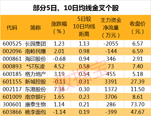 截至最新,有13只A股的5日均线主动上穿10日均线,其中长园集团、南岭民爆、海印股份等个股的5日均线较10日均线距离最大,分别达1.13%、0.98%、0.94%。