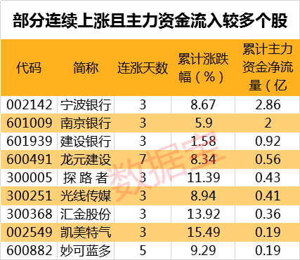 值得注意的是,38只连续上涨个股中,4只个股期间主力资金累计净流入超过5000万元。其中,累计资金流入最多的为宁波银行,主力资金累计流入2.86亿元。