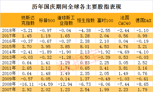 排除上述特殊的两个年份,证券时报·数据宝统计显示,其他年份外围市场均表现平稳,而且以上涨居多。在过去12年,纳指有6次国庆期间下跌,标普和道指各有5次,欧洲股指下跌次数最多的是德国DAX,也有6次下跌。不过,恒生指数在国庆期间表现最好,过去12年除了2008年和2018年,其他10年均表现为上涨,2015年甚至大涨超过8%。