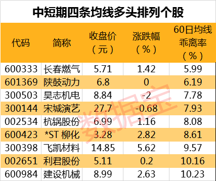 截至最新收盘,76只个股5日、10日、20日、60日四条均线近日呈多头排列。其中长春燃气、陕鼓动力、昊志机电股价与60日均线的乖离率最小,分别为5.99%、6.19%、7.78%。