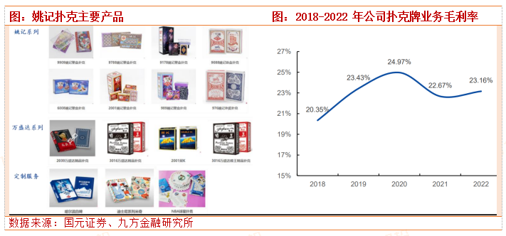 公司深耕扑克牌行业多年,贡献稳定业绩。公司起家于扑克牌的生产及销售业务,深耕扑克牌行业多年,旗下子公司上海姚记销售、启东姚记扑克实业、安徽姚记扑克实业、浙江万盛达扑克等子公司负责扑克牌的生产及销售工作。2022年公司实现扑克牌销量10.37亿副,2021年公司扑克牌销售国内市场份额约为29%。2022年,公司扑克牌业务毛利率维持在23.16%,较2021年上升0.49pct,近年毛利率均在20%以上。公司拓展游戏运营和数字营销业务为传统扑克牌销售业务提供多元渠道,通过“第55张扑克牌”推广移动游戏业务,实现多业务协同发展。