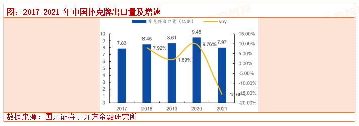 扑克牌行业日趋成熟,年消费量平稳增长。我国作为纸牌行业的生产和消费大国,也是扑克牌出口大国。2019年,我国扑克牌年消费量已达40.40亿副。2021年中国扑克牌出口量达7.97亿副,据中国海关数据显示,2017年至2021年,我国扑克净出口数量常年维持在7亿副以上。