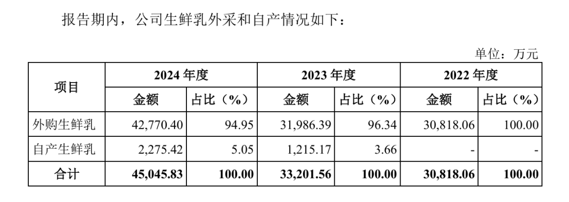 发行人采购数据显示,主要原材料生鲜乳从2022年到2024年的采购金额占比分别为59.76%、58.25%、53.79%。而公司生鲜乳外购和自产情况显示,2022年到2024年外购生鲜乳占比分别高达100%、96.34%、94.95%,自产占比仅为0%、3.66%、5.05%。