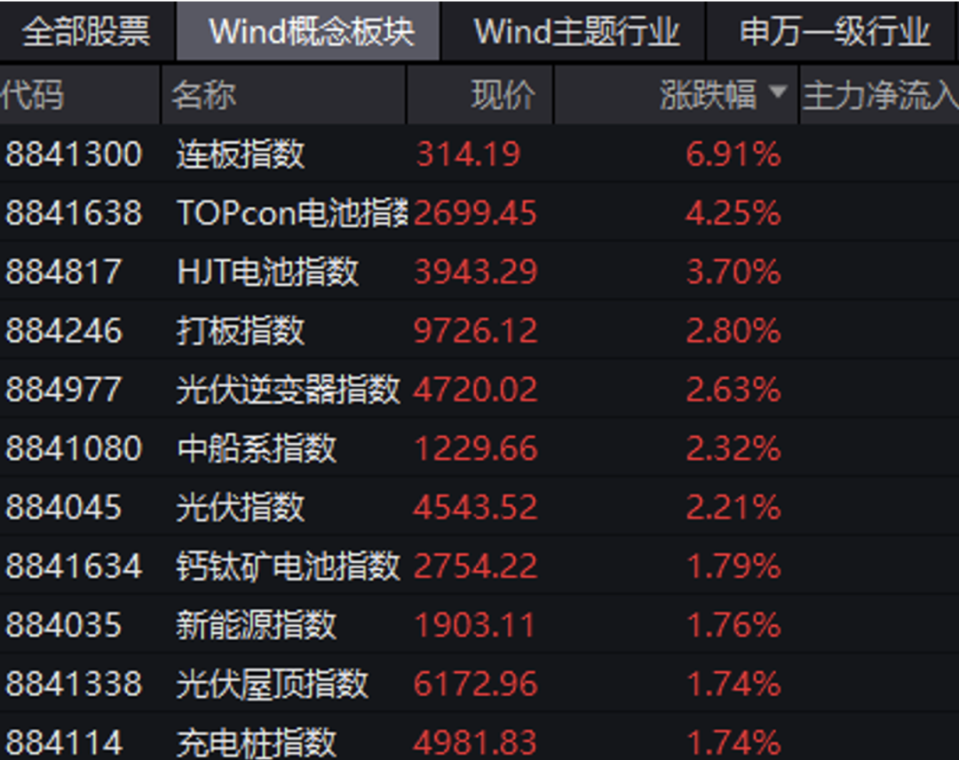 个股方面,帝科股份20cm涨停,钧达股份涨停,捷佳伟创、聚合材料、东方日升等涨超5%。一批龙头股也大幅上涨,晶澳科技涨超5%,天合光能、晶科能源等涨超3%。