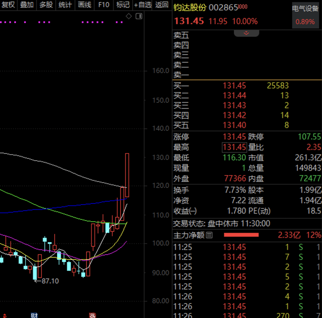 除了工业富联,光伏龙头早盘继续强势表现,晶澳科技、天合光能等个股均大幅上涨。近期光伏板块主要炒作N型电池股票,相关公司股价明显异动,钧达股份近10个交易日录得3个涨停板。